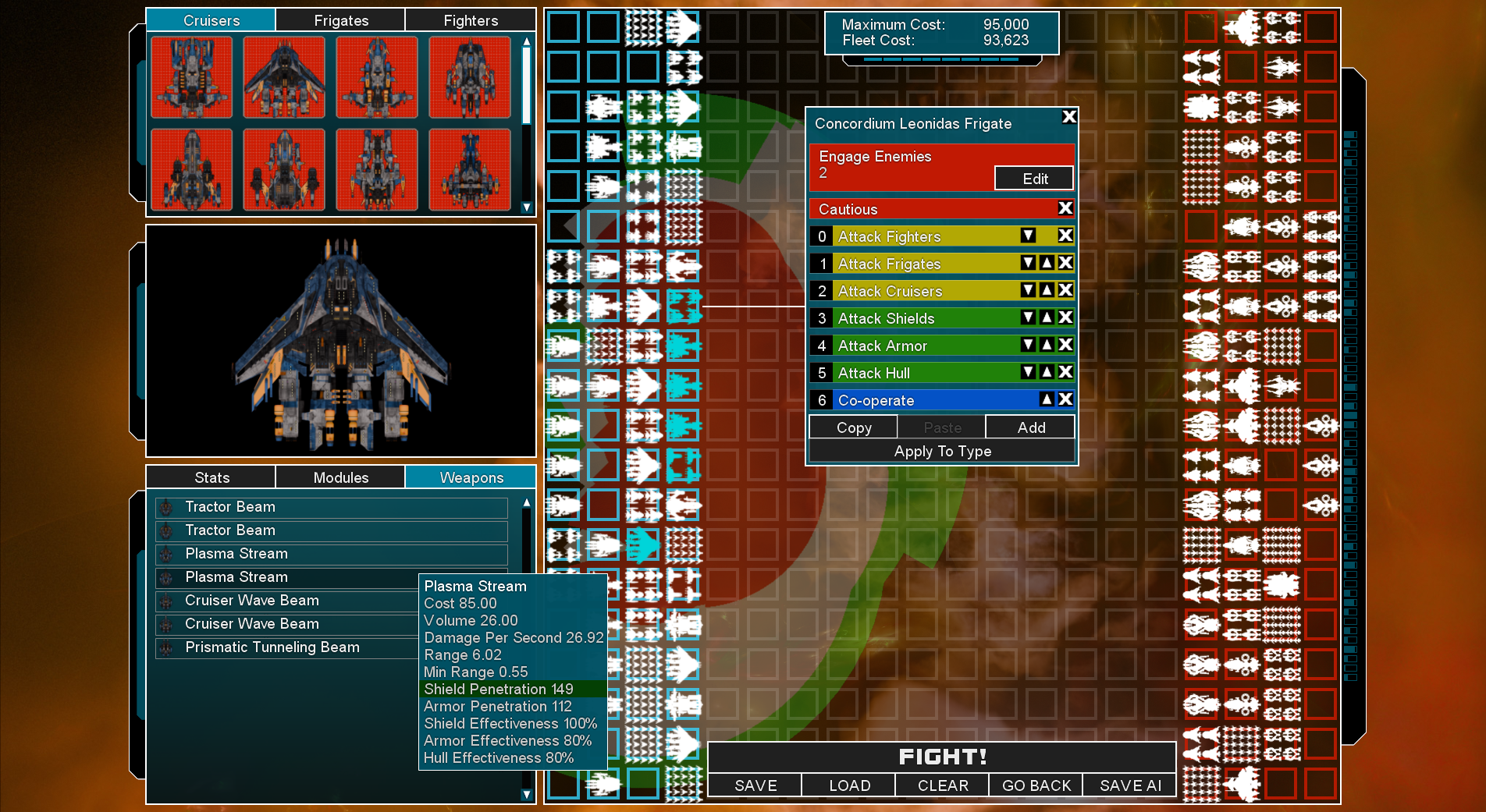 In addition to fiddling with this overlay UI, I have also been improving the ‘ship role descriptions’ that are shown as tooltips for a ship design. I’m basically approaching the problem in 3 different directions. Select a ship…and the overlay should show you its weapon ranges on the map. Select a ship-type at the top-left, and then hover over a weapon name, and you get that big tooltip (see the one for ‘Plasma Stream’ above), which lists everything, including range. If the range is especially low or high, it gets a colour (red/green) highlight. Thats true for shield and armour penetration too…