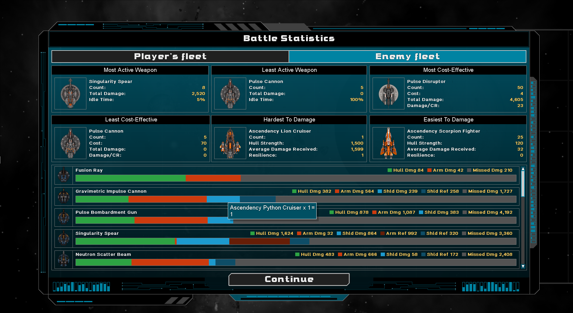 The biggest issue was that the list of stats chosen didn’t seem to be that helpful. If your fleet was 95% frigates, why bore you with the ‘best’ cruiser and fighter weapons? I re-designed the system to show you more interesting key stats such as the most cost-effective weapon, the ship that was hardest to damage (toughest?) and the weapons that were in use the most (or least). These stats are way more helpful: